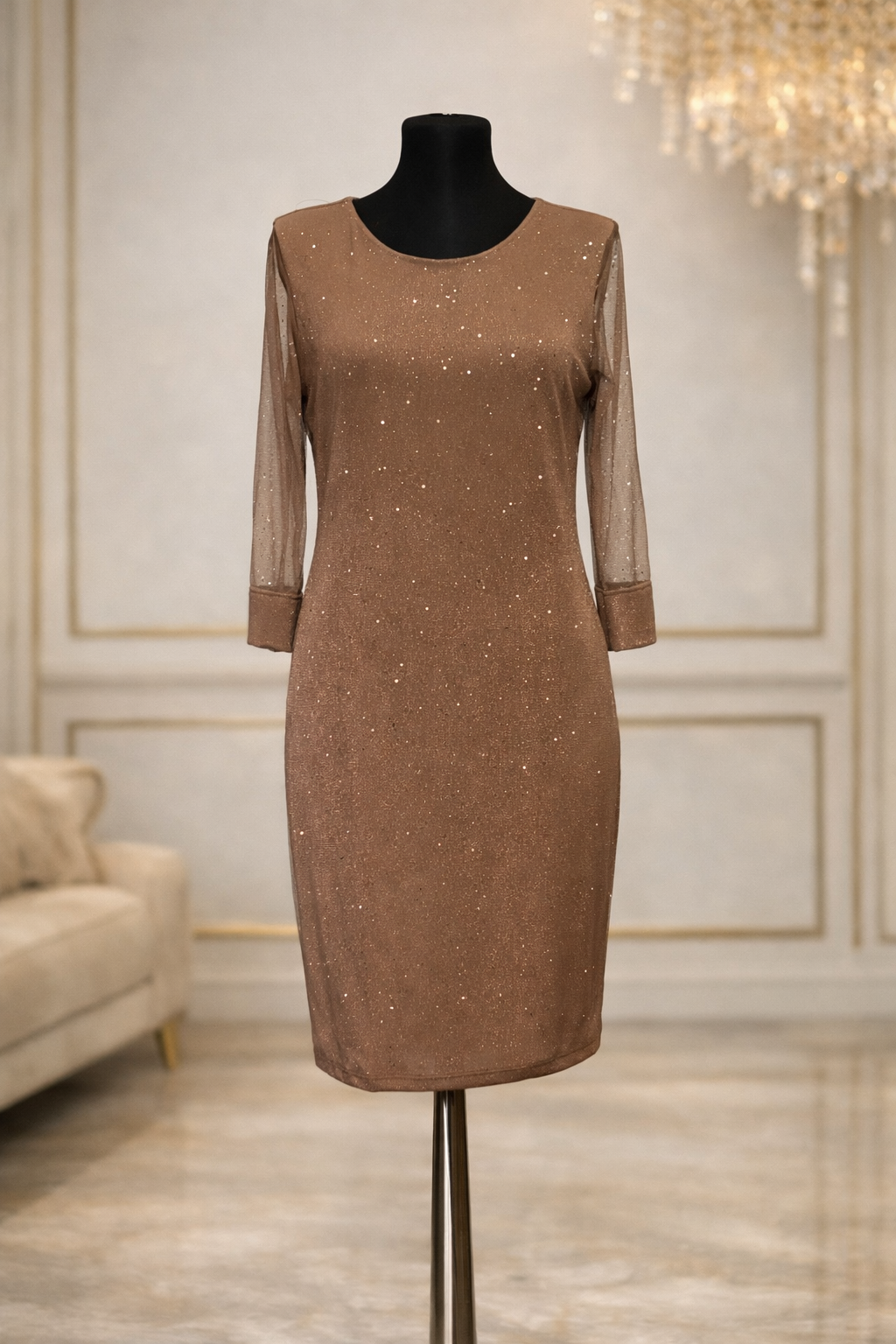 Elegantna haljina u nežnoj puder-roze nijansi sa diskretnim svetlucavim detaljima koja je dizajnirana da savršeno pristaje ženama sa oblinama. Klasičan kroj prati liniju tela i pruža udobnost, dok blagi sjaj materijala daje sofisticiran i svečan izgled.