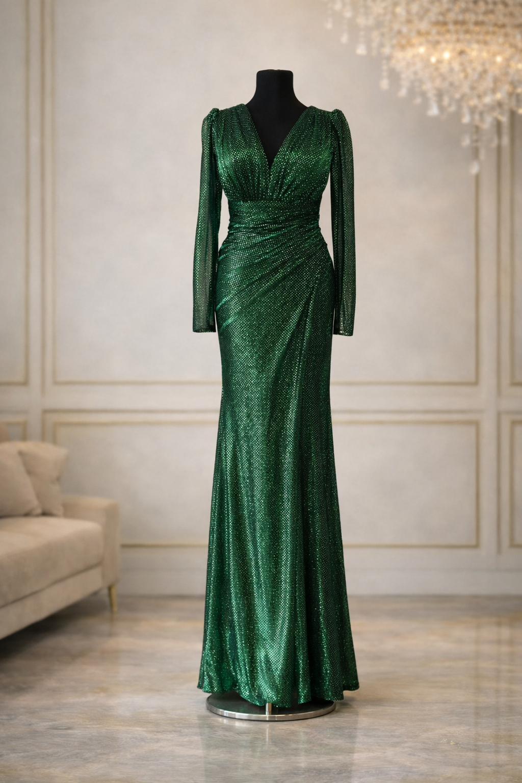 Ova upečatljiva večernja haljina u dubokoj smaragdnoj boji donosi savršen spoj glamura i ženstvene elegancije. Tkanina sa diskretnim zlatnim detaljima na sebi stvara sofisticiran sjaj koji privlači poglede pri svakom pokretu.