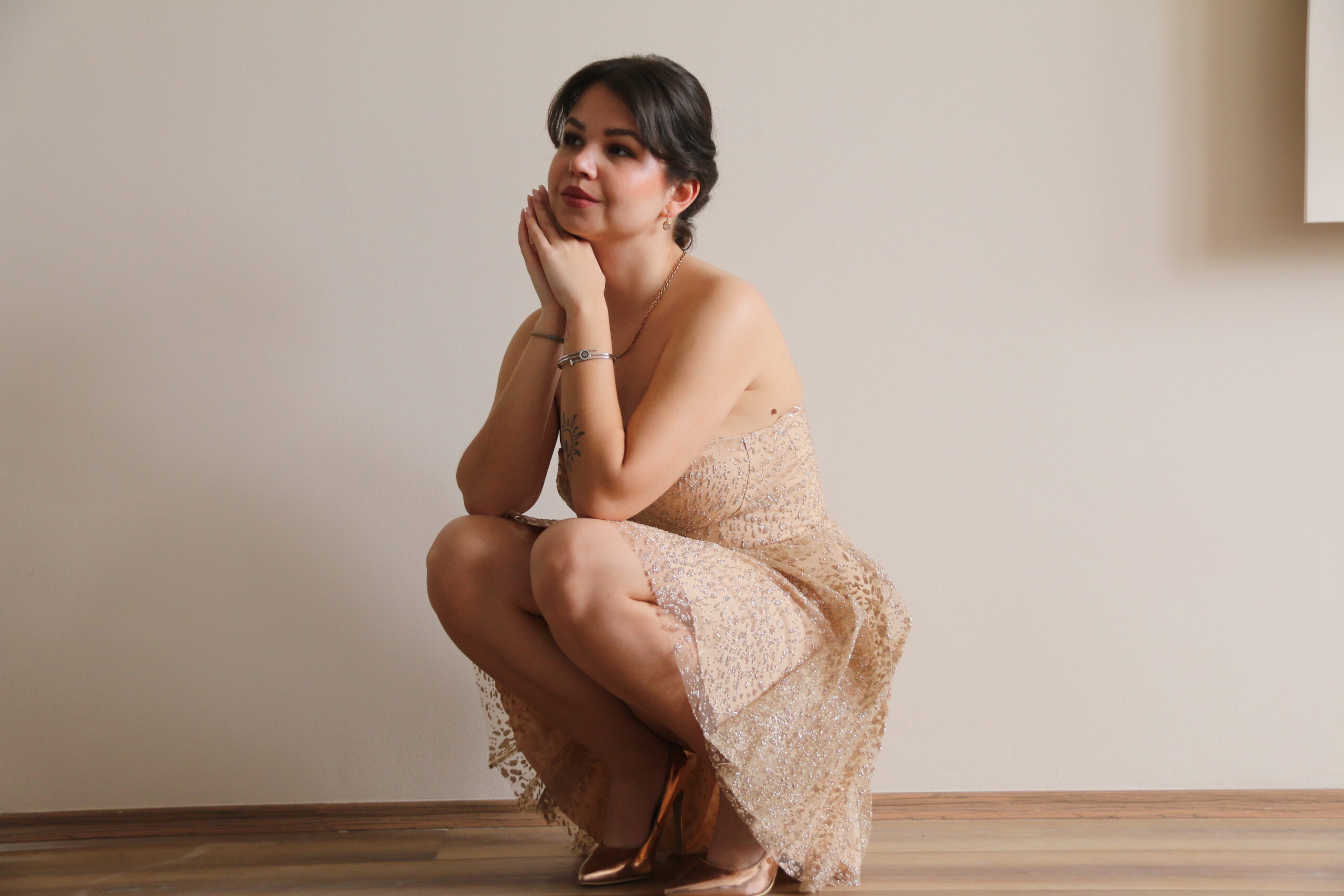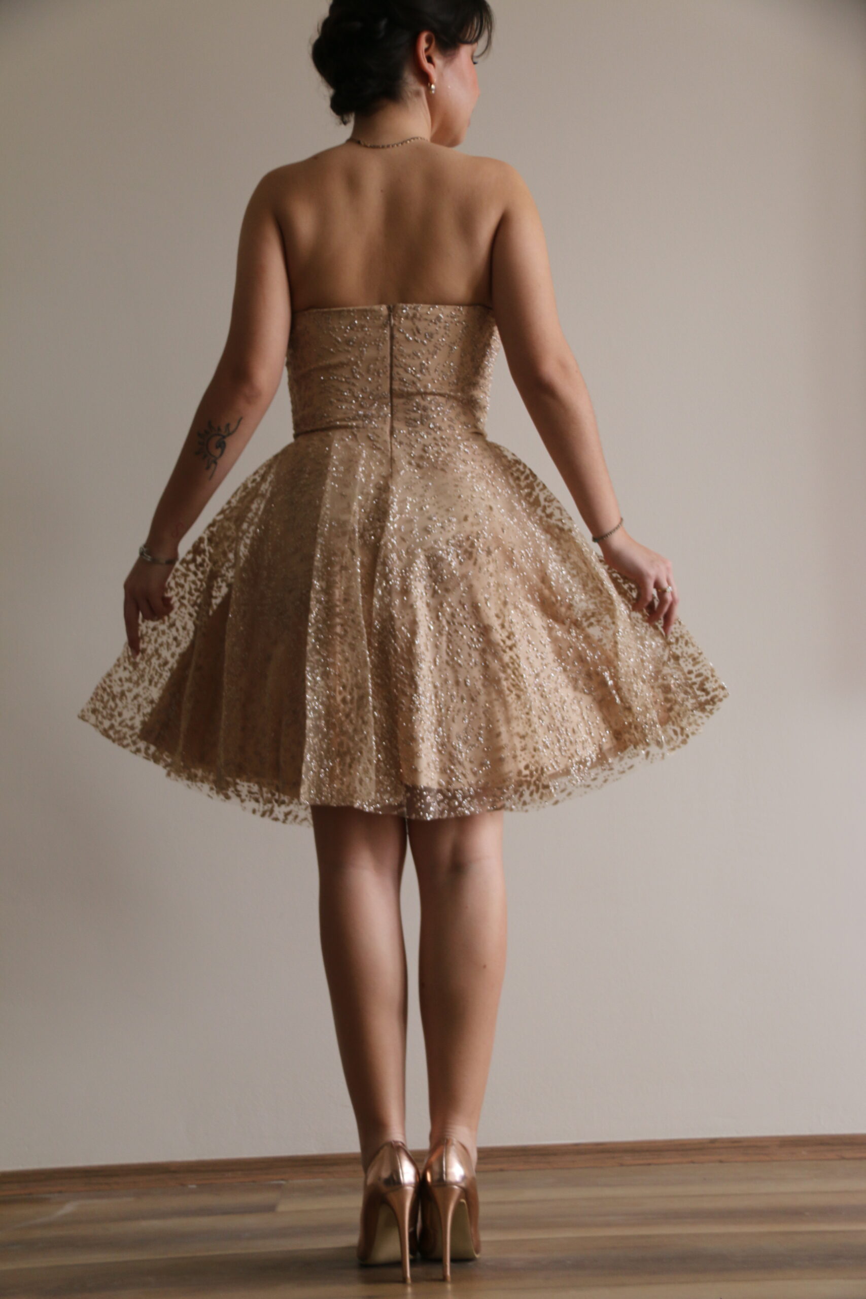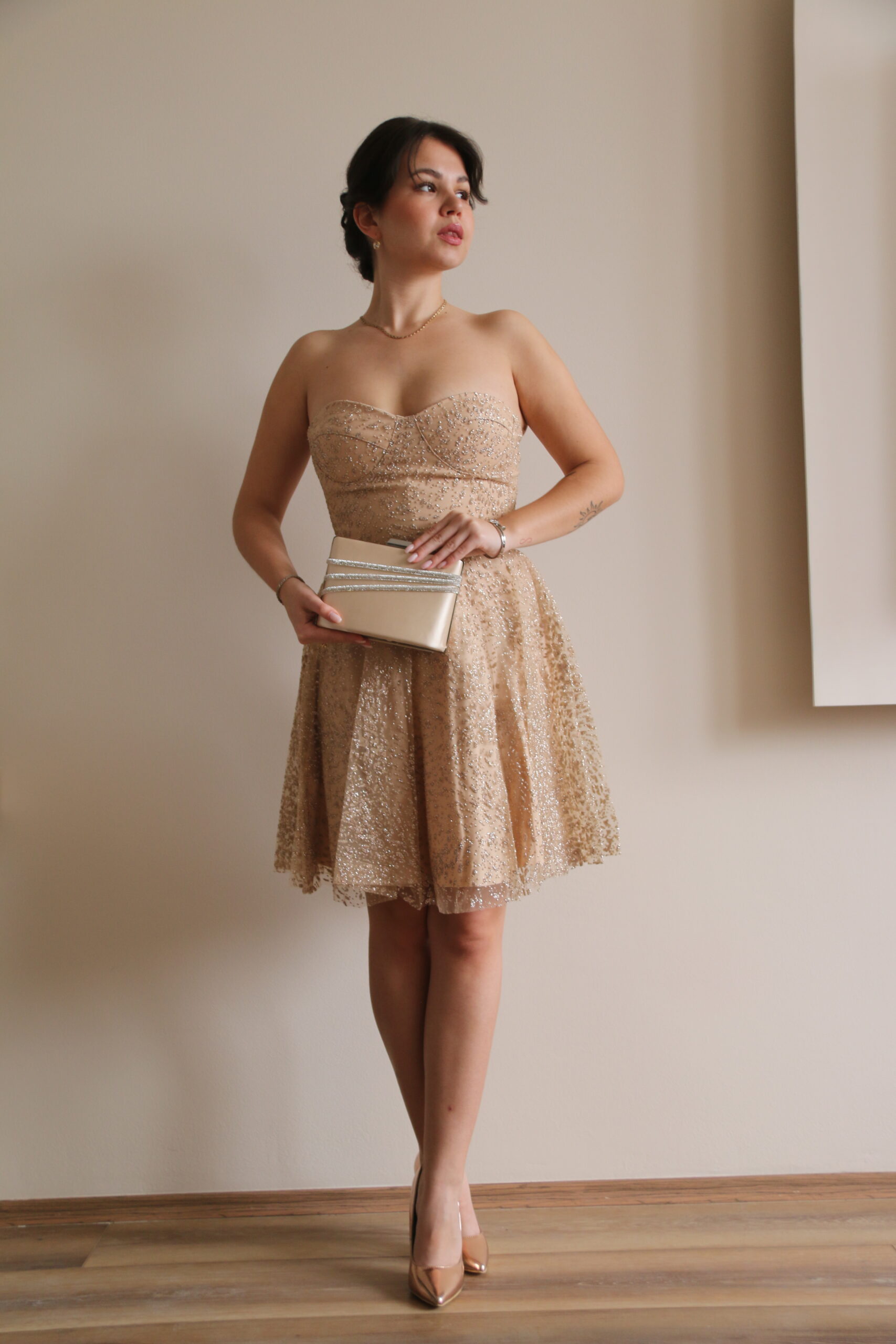 Ova elegantna mini haljina u nežnoj champagne nijansi odiše suptilnim luksuzom i romantičnom elegancijom. Gornji deo bez bretela sa blago oblikovanim dekolteom naglašava liniju ramena i daje haljini sofisticiran, ženstven izgled.