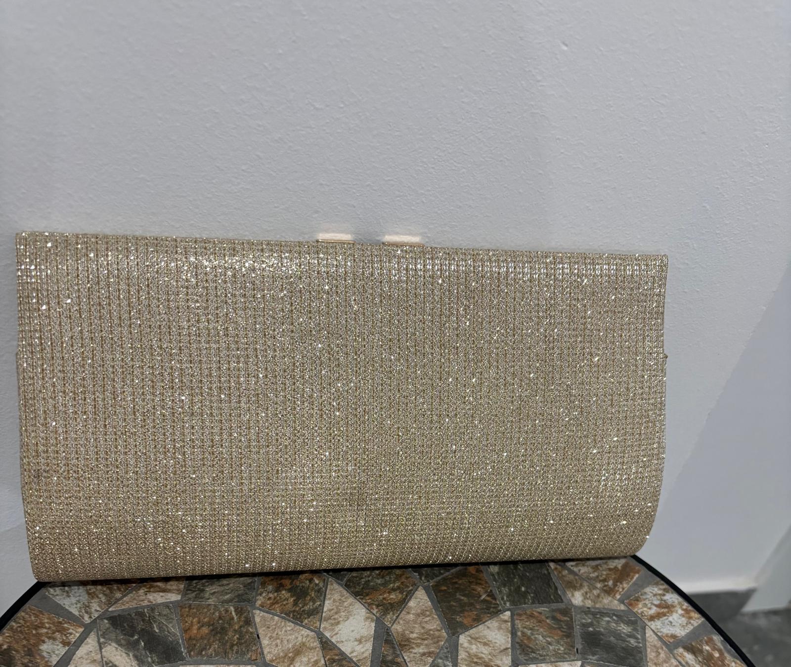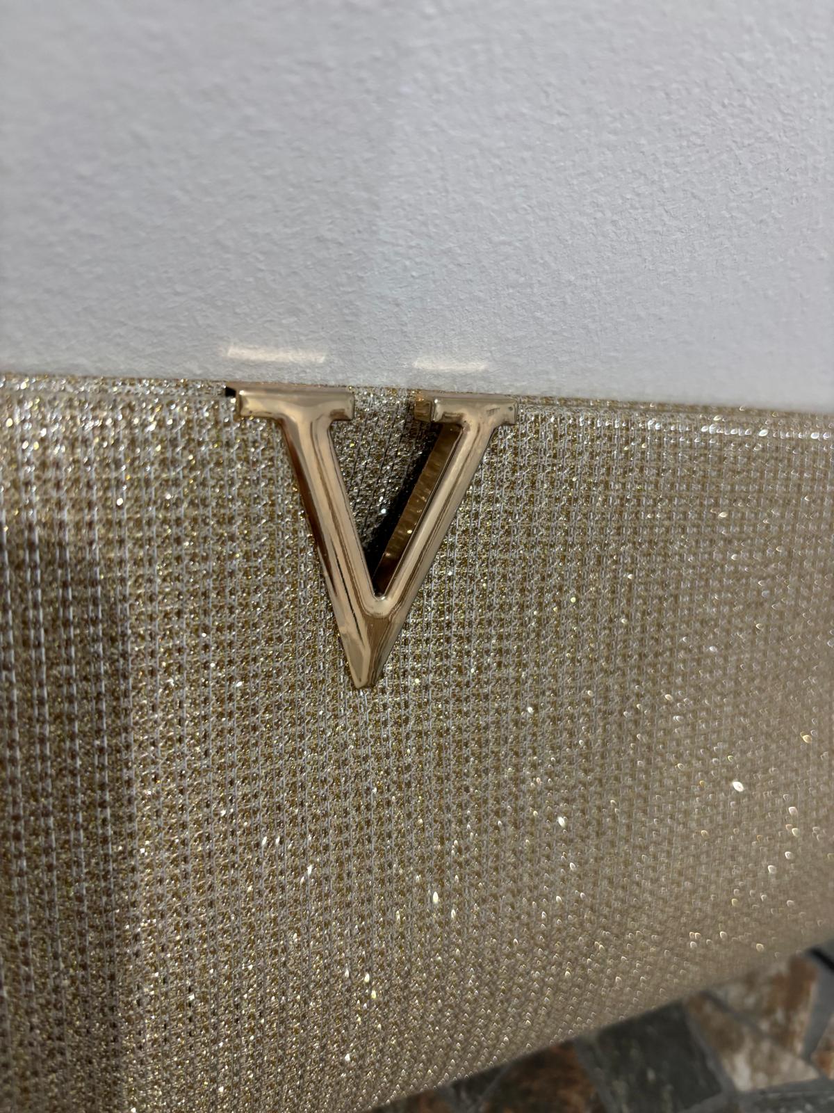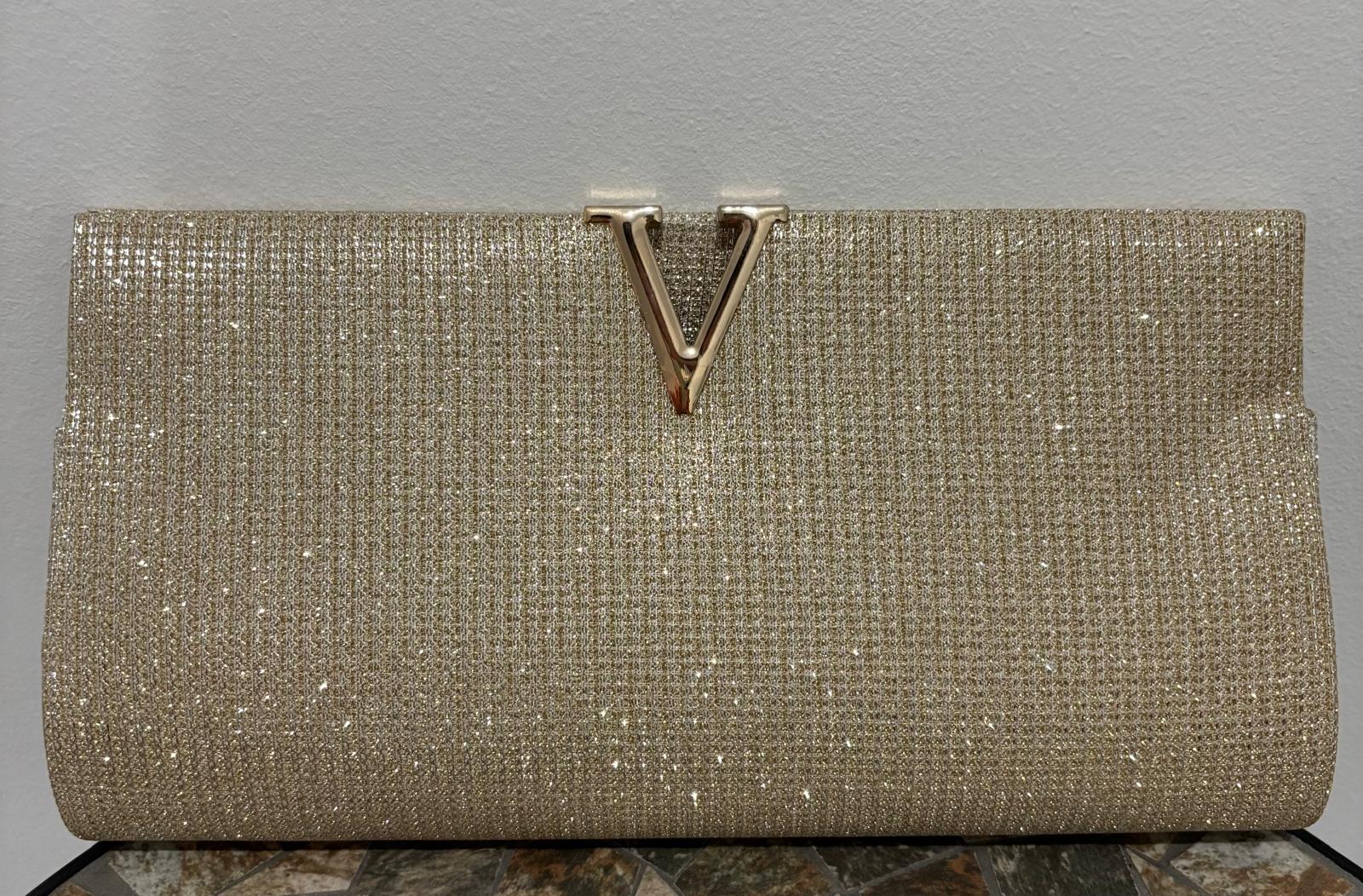 Zlatna torbica sa finim shimmer efektom i elegantnim V detaljem odiše luksuzom i sofisticiranošću. Savršena za svečane prilike, venčanja i večernje izlaske – gde svaki detalj pravi razliku.
