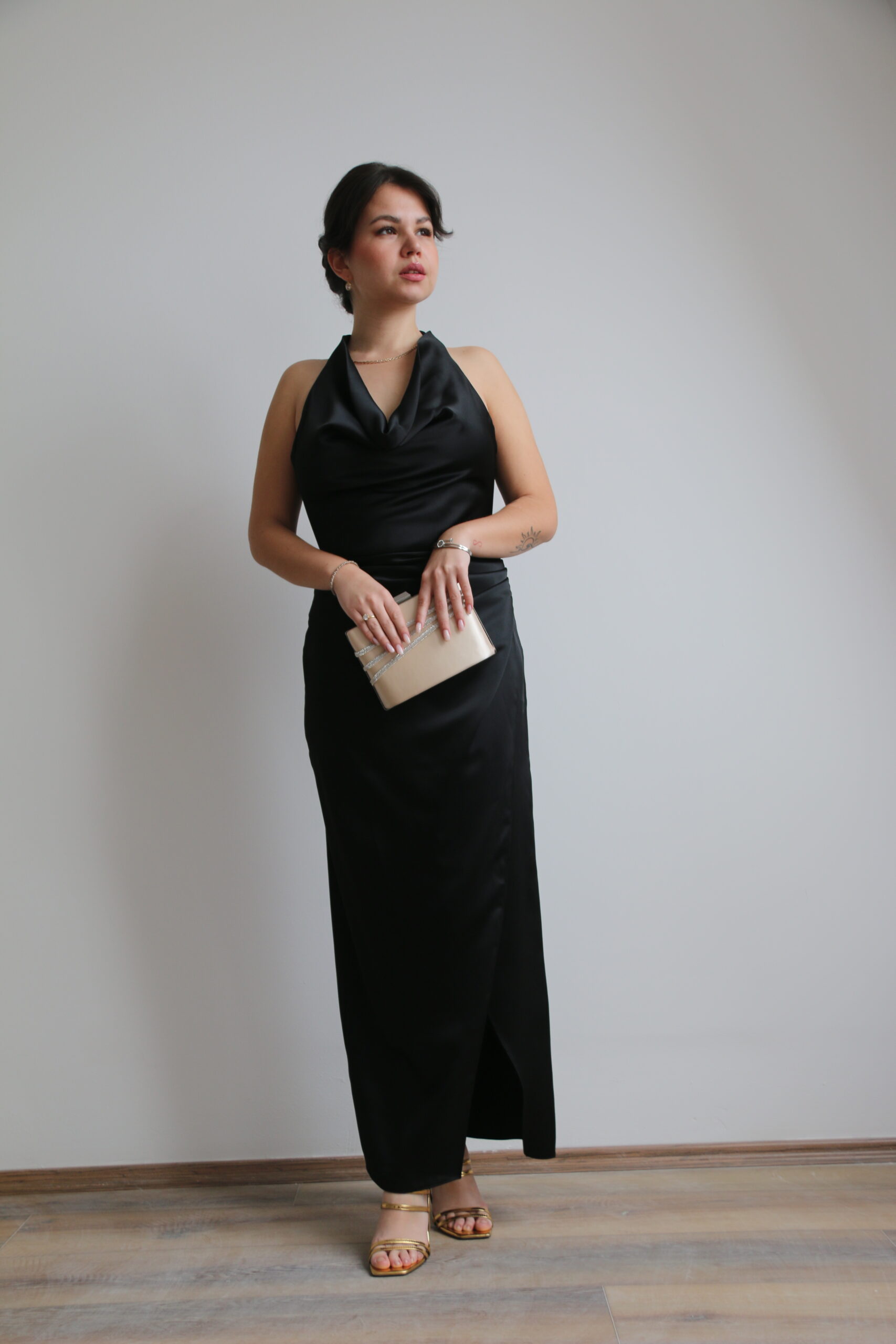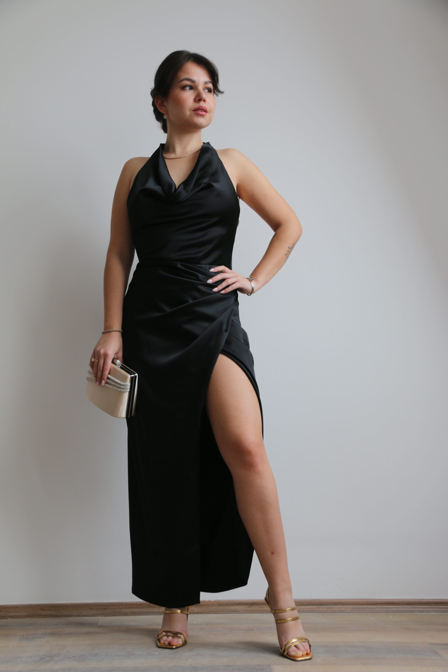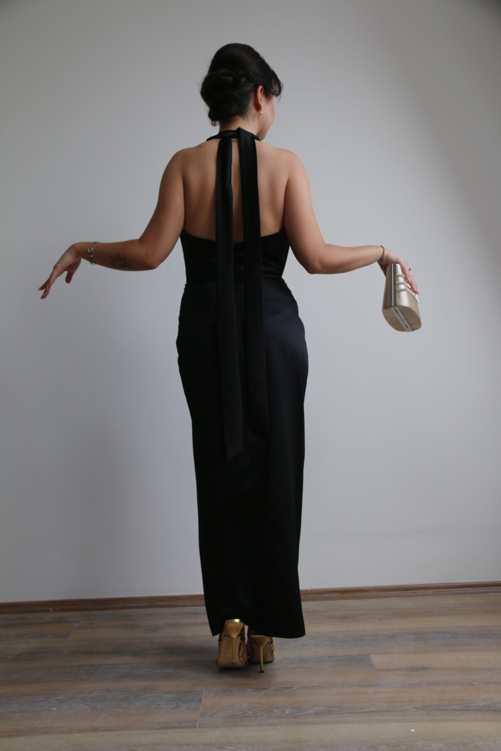 Elegantna haljina od svilenkastog materijala sa halter krojem i otvorenim leđima naglašava siluetu i donosi savršen balans minimalizma i glamura.