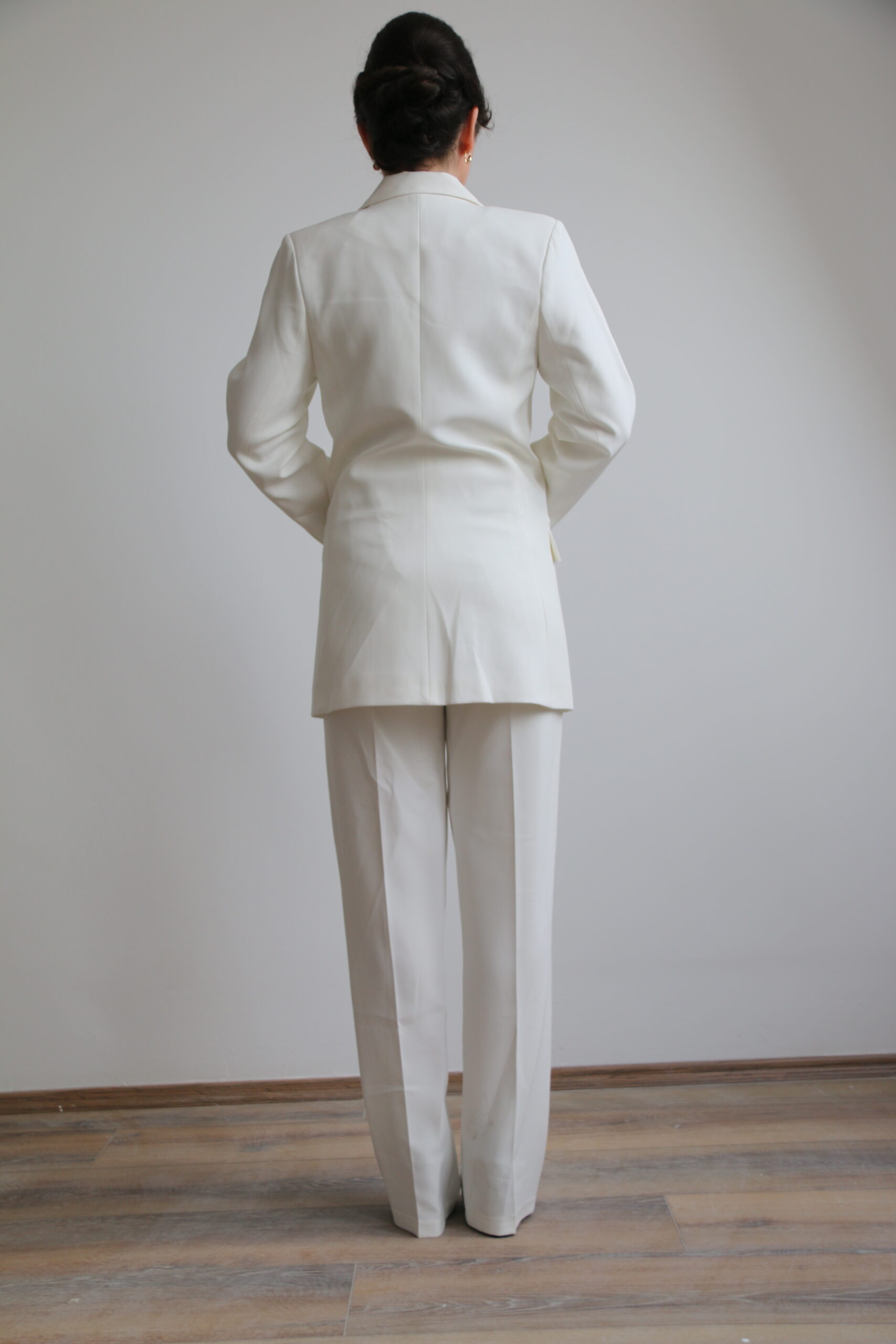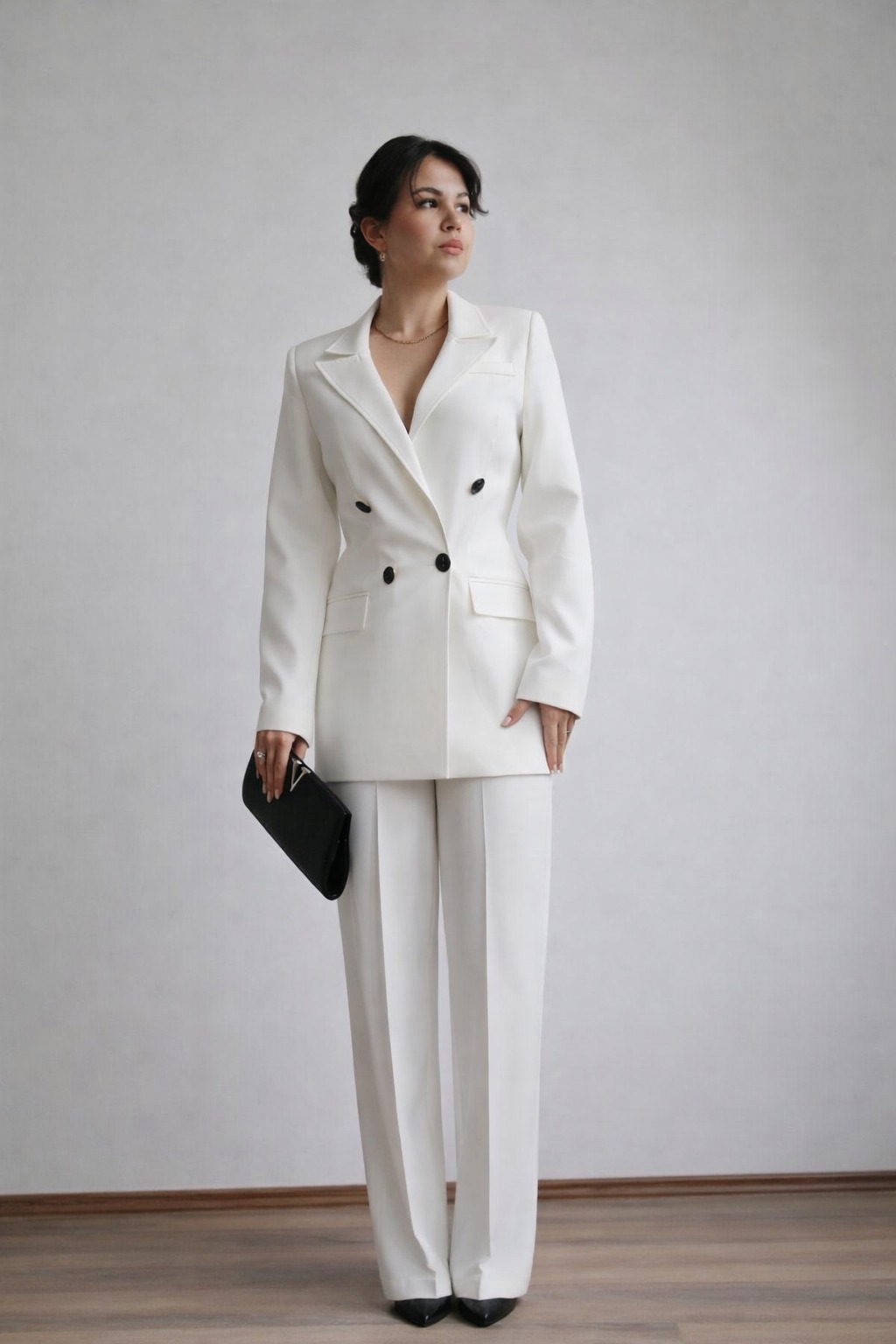 Elegantno belo odelo sa dvorednim sakoom i klasičnim krojem koje naglašava siluetu i donosi sofisticiran izgled.
