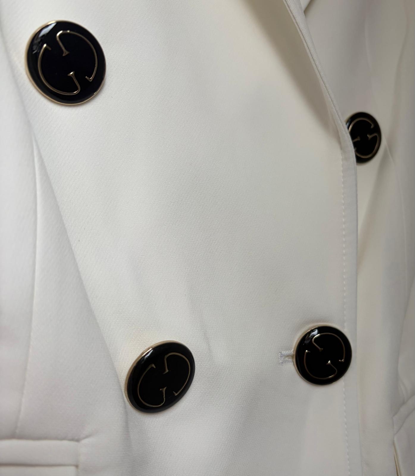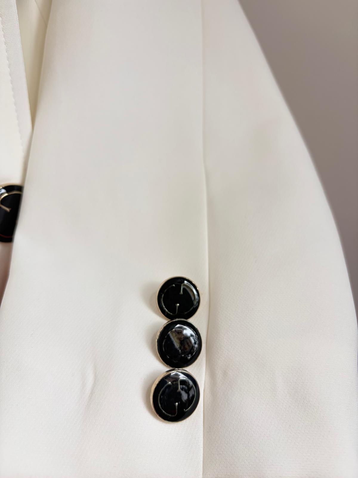 Elegantno belo odelo koje odiše čistim luksuzom i bezvremenskom sofisticiranošću. Strukirani sako sa dvorednim kopčanjem i kontrastnim dugmadima savršeno oblikuje figuru i donosi snažan, ali ženstven izgled, dok pantalone ravnog kroja pružaju udobnost i elegantan pad.