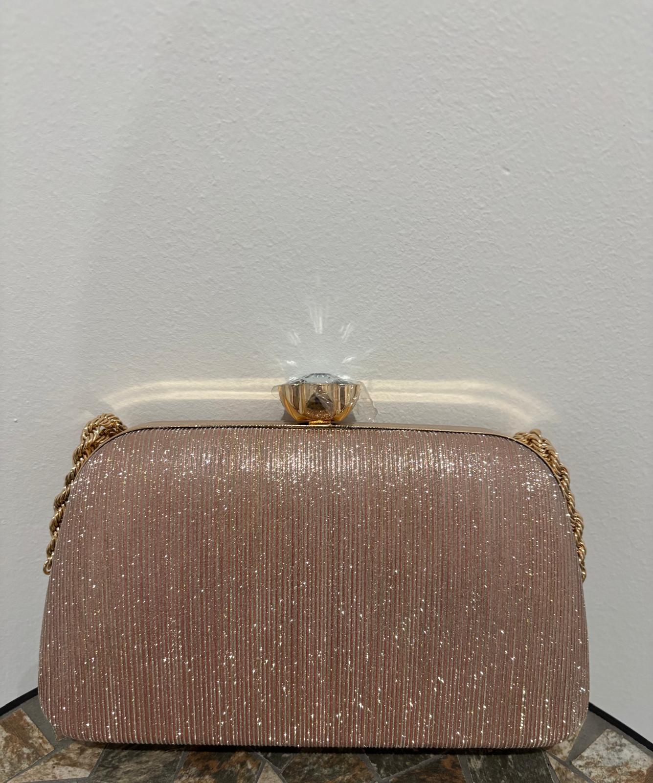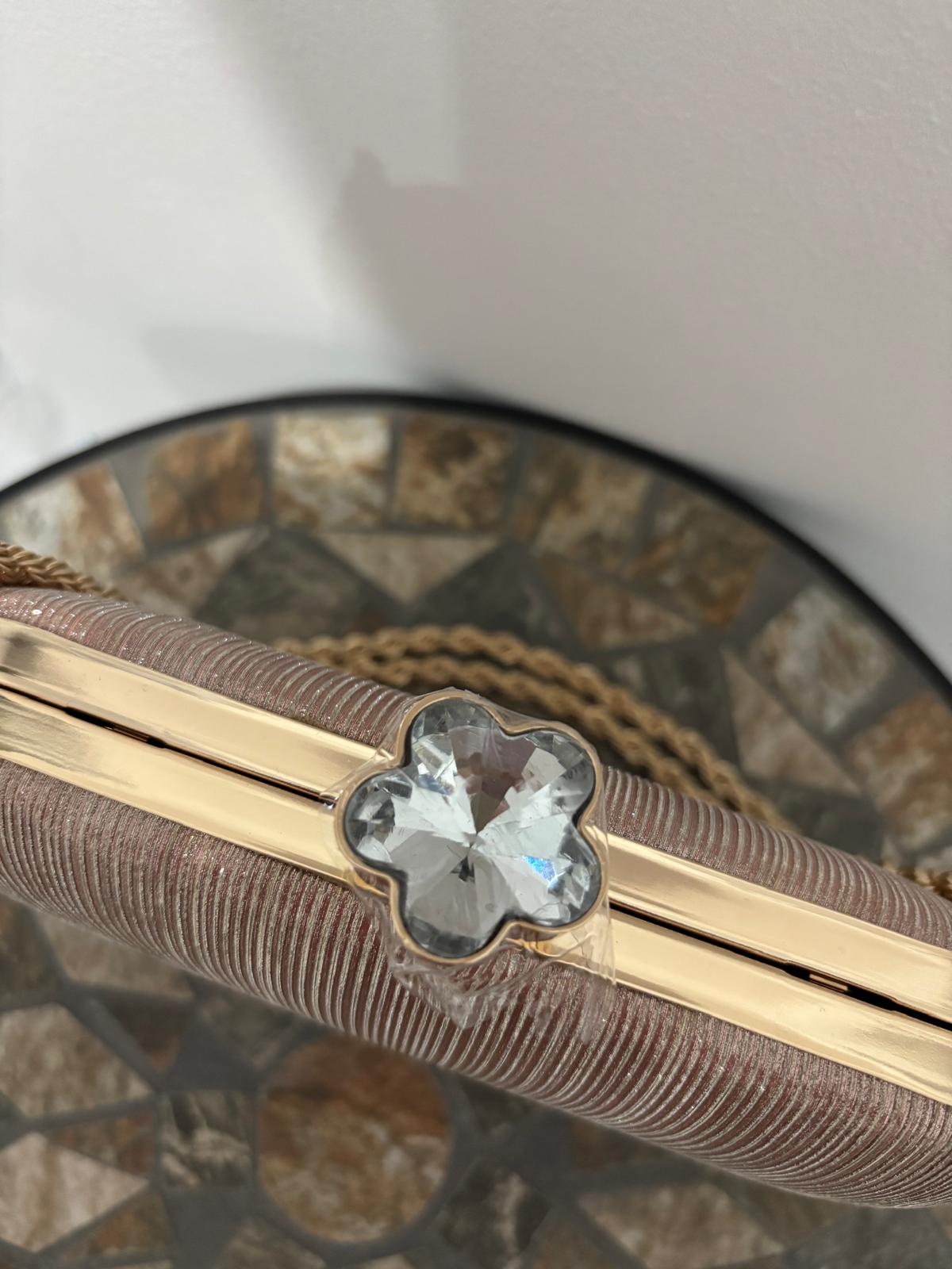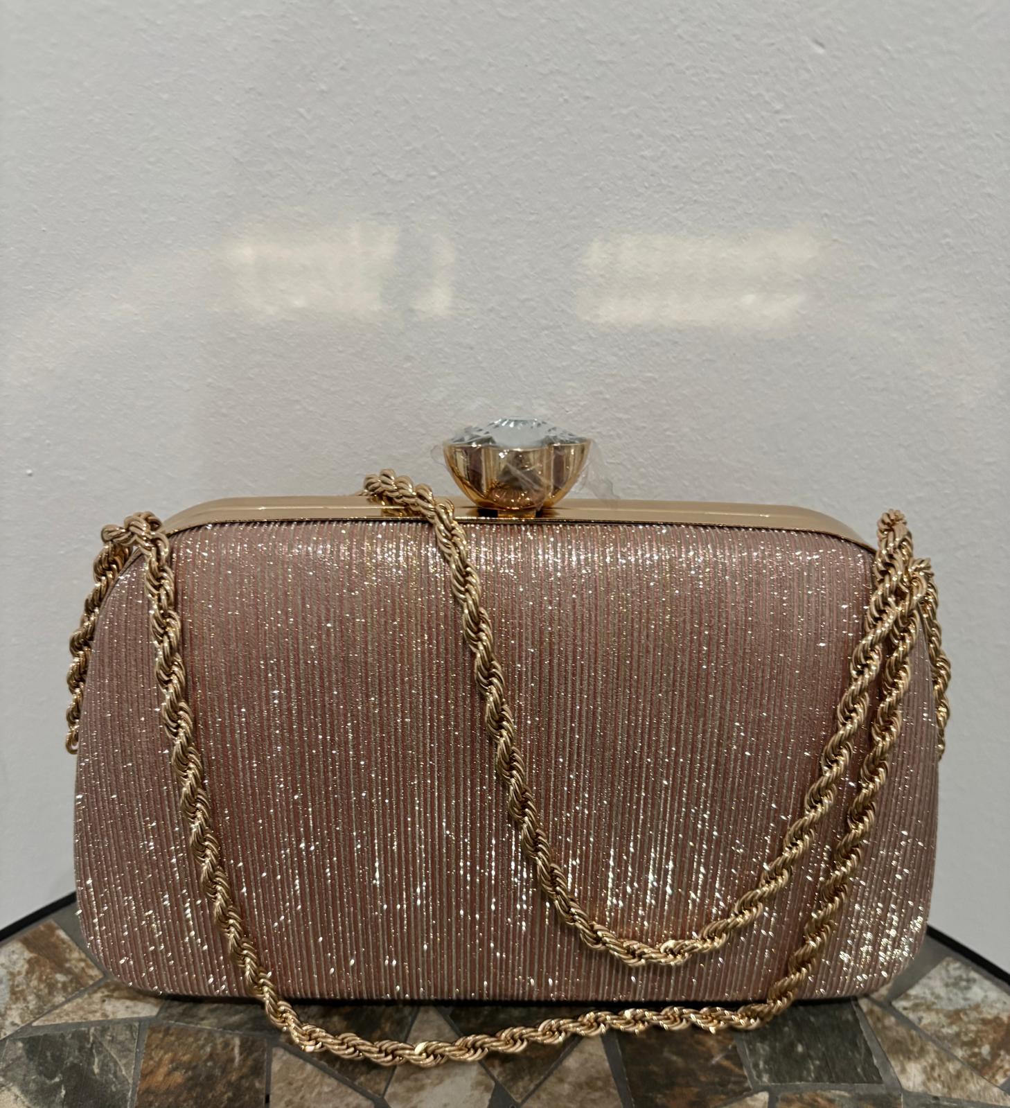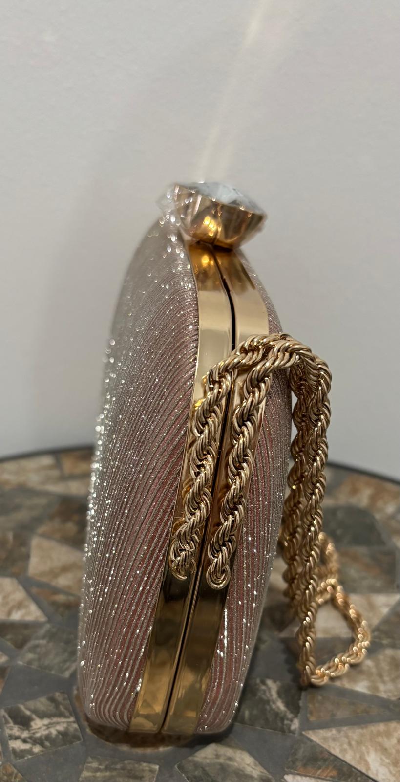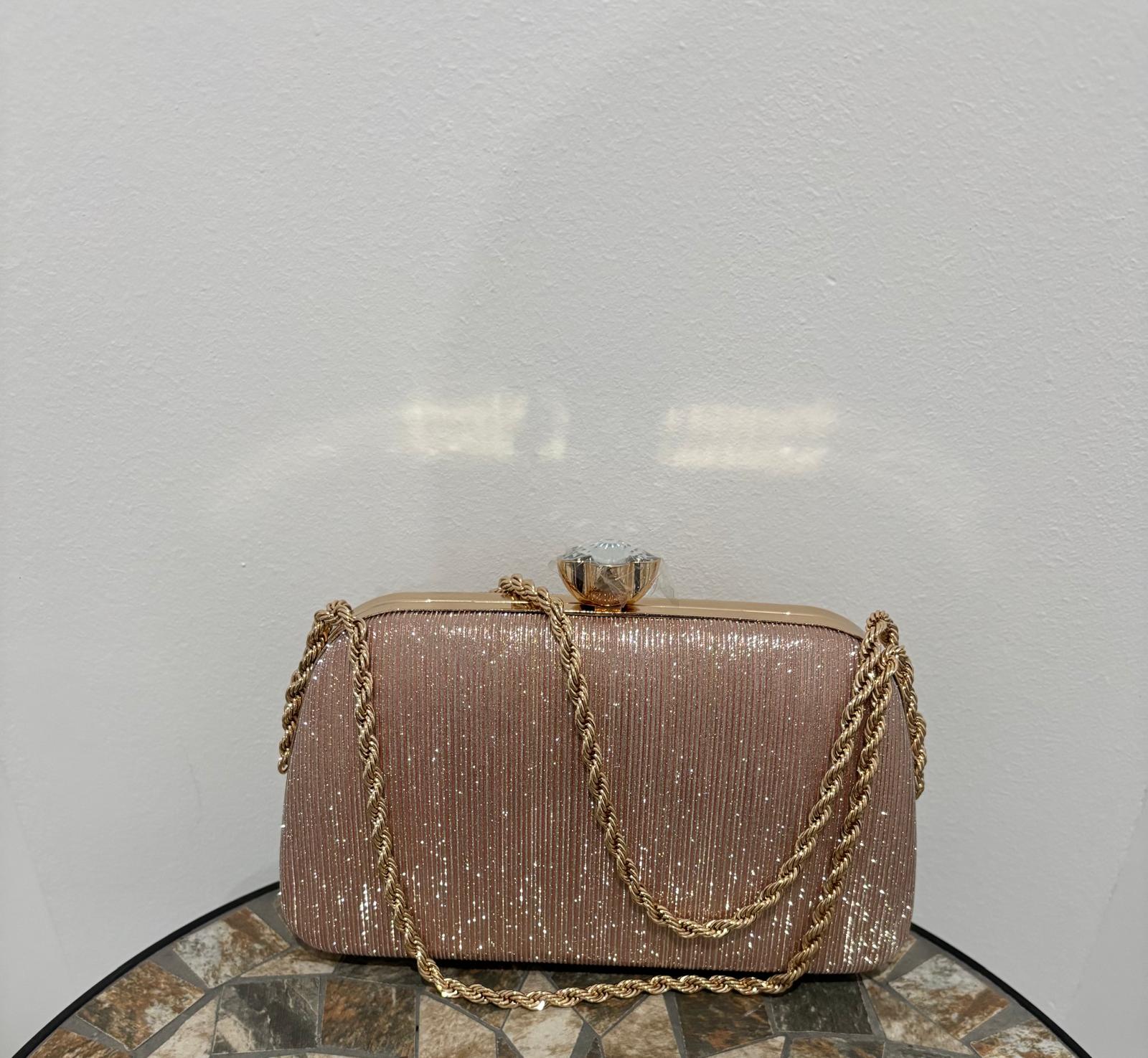 Nežna rose gold torbica sa finim sjajem i zlatnim lancem donosi savršenu ravnotežu između elegancije i ženstvenosti. Diskretni svetlucavi efekat i luksuzni detalji čine je idealnim dodatkom za posebne prilike, proslave i večernje kombinacije.