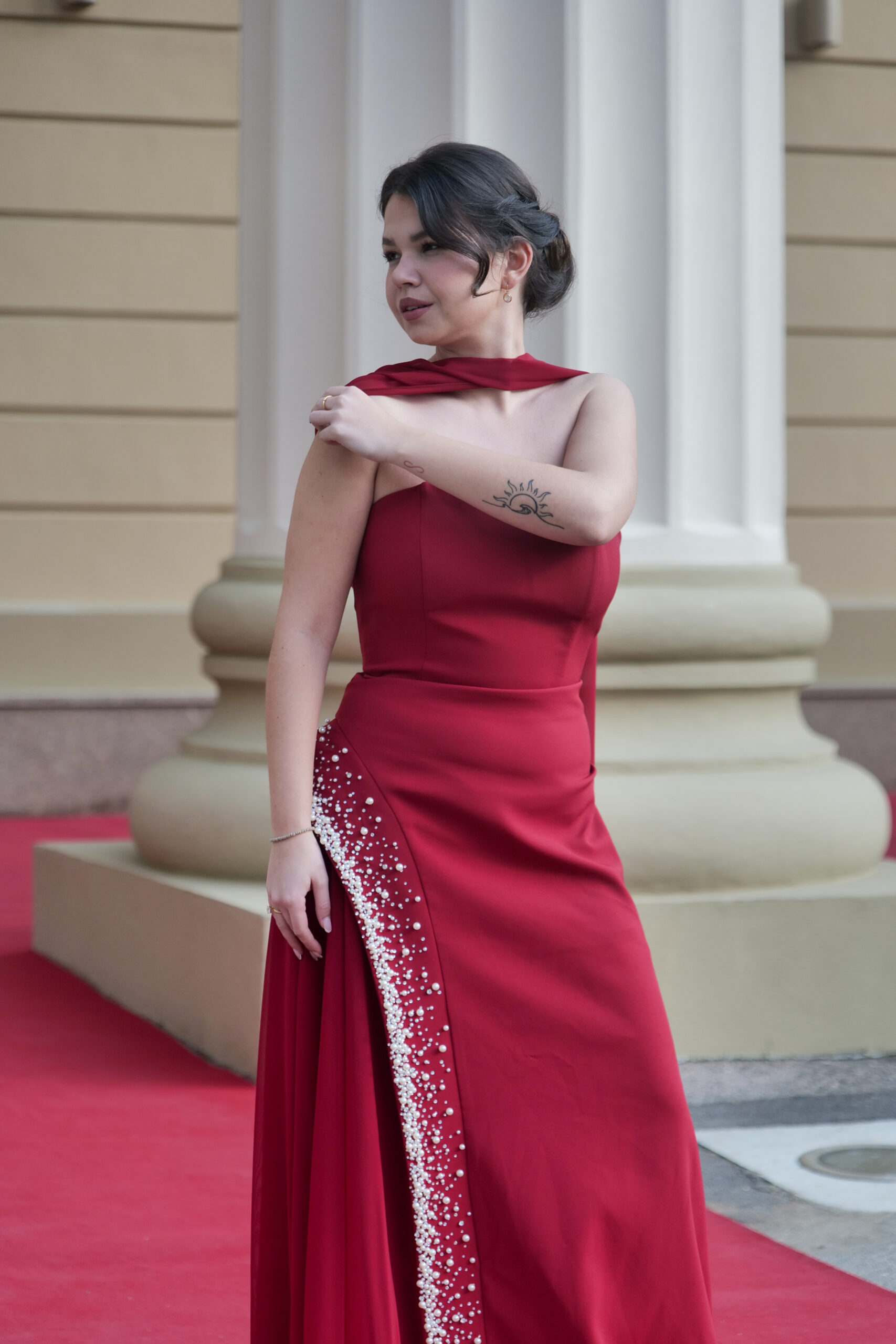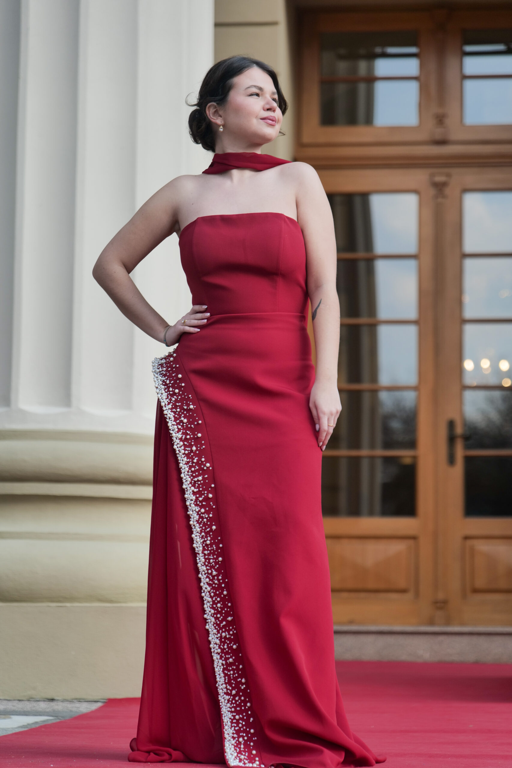 Ova raskošna večernja haljina u dubokoj, profinjenoj nijansi crvene predstavlja savršen spoj minimalizma i luksuza. Elegantni kroj bez bretela ističe liniju ramena i dekoltea, dok precizno oblikovana silueta prati figuru i naglašava ženstvenost sa izuzetnom sofisticiranošću.